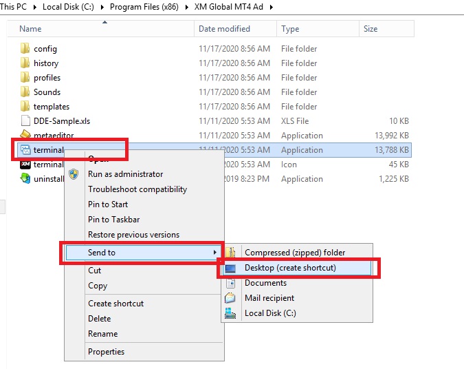 Luego de esto debemos entrar a esa carpeta que acabamos de copiar y crear el acceso directo del mt4 al escritorio para poderlo abrir mas facilmente.