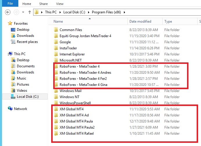 En la imagen anterior hay 2 imágenes una es mi PC y la otra es el VPS en ambas pueden ver la opción que hay que escoger. Luego nos debe abrir la carpeta de instalación del MT4.
