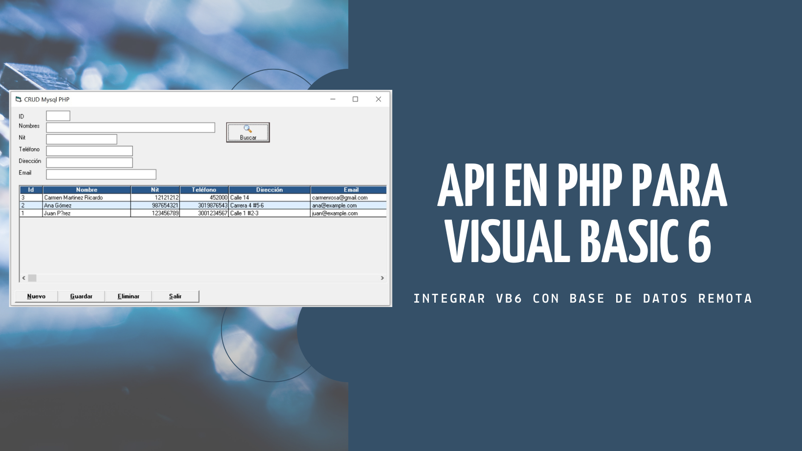 Saludos, en este tutorial aprenderás a integrar tu aplicación de Visual Basic 6 con un API PHP que desarrollaremos para listar clientes de manera dinámica, lo que pretendo con este tutorial es cómo puede enviar datos desde vb6 a un servidor remoto con PHP y guardar datos en una base de dato MySQL y que el mismo PHP retorne datos, esto puede ser utilizar para tener datos público accesibles desde un dispositivo móvil desde cualquier parte del mudo claro esta si el PHP se encuentra en un dominio publico.