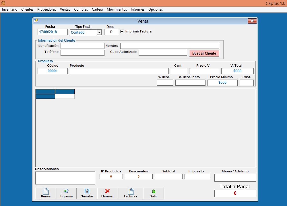 La ventana esta compuesta por el encabezado con contiene el numero de factura, fecha, termino y días.