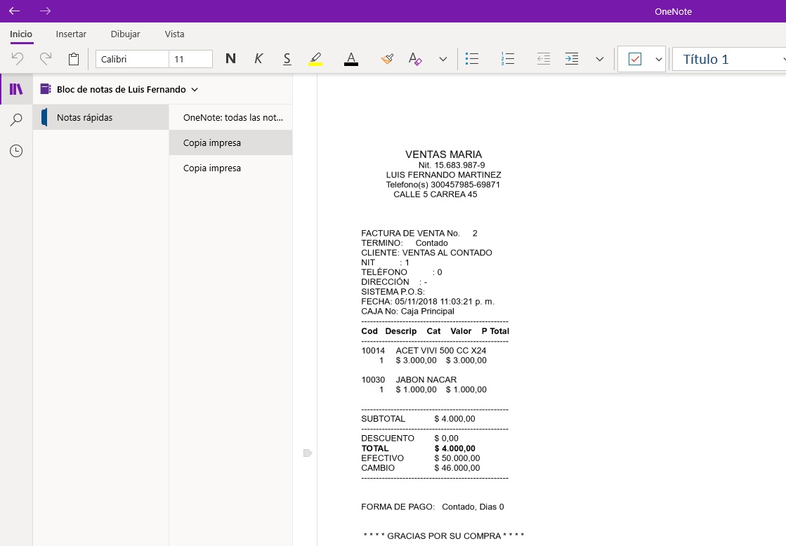 Para ver como queda la factura debemos escoger la impresora que instala el One Note de Microsoft que lo que hace es darnos una vista previa de la factura.