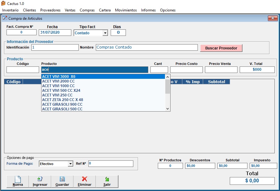 Ya entrando el el modulo de compras lo primero es hacer la parte del ingreso de productos a la factura de Compra.