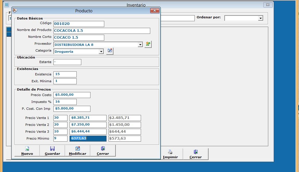 Para modificar un producto se debe seleccionar de la lista del msGrid y luego dar clic en el botón modificar o dar doble clic sobre el producto para que abra la ventana de Producto y nos muestre todos los datos del producto seleccionado.