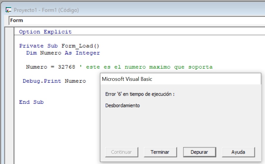 Si el numero sobrepasa ese valor Visual Basic enviara un error, en tal caso hay que cambiar el tipo de Variable a Long que permite numero mas grandes.