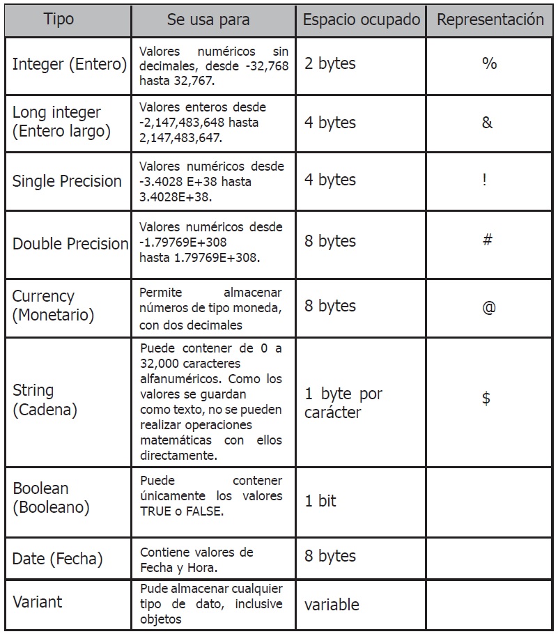 Las variables numéricas tiene cuatro tipos básicos: enteros, enteros largos, simples y dobles. Cada uno de ellos tiene características especiales. Por su lado, los textos también se pueden guardar en diferentes tipos de variables. El espacio de memoria que ocupa cada tipo de variable es diferente.