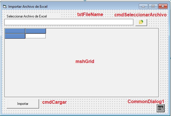 Para lograr la importación lo primero es seleccionar el archivo de excel usando el control CommonDialog: