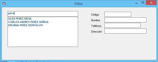 Al presionar en el teclado la tecla flecha Abajo automáticamente se pasa a la lista para poder moverse en el listado de coincidencias. Los procedimientos usados fueron: