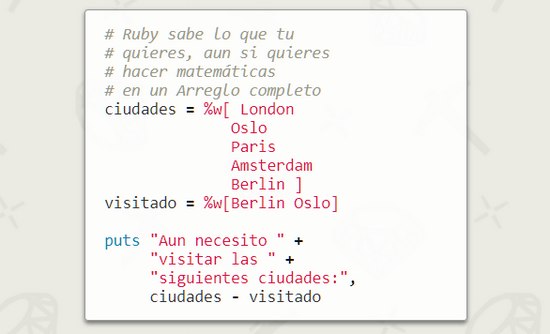 La principal característica de Ruby es que es muy fácil de leer. Seguro que consigues adivinar qué hace este programa, incluso sin saber si una palabra de Ruby:
