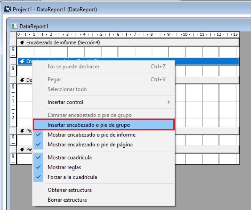 Adjunto un proyecto de ejemplo que puedes descarga y probar: Proyecto Reporte de Grupo Visual Basic 6 (1798 descargas )