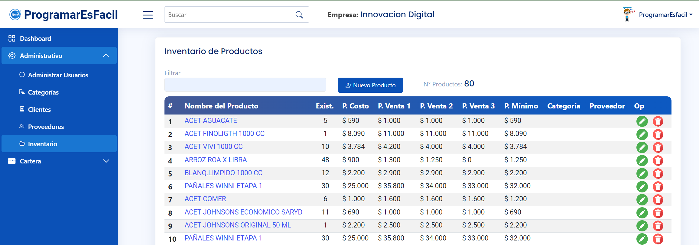 De la misma forma se hacen con los productos, proveedores, clientes y cartera.