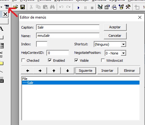 Para crear el Menu debemos dar clic en el icono del menú y luego escribir el caption o Titulo y luego el nombre del menú que lleva las mismas reglas que una variable.