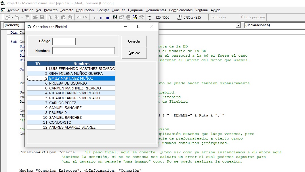 En el formulario que construimos en el articulo anterior Visual Basic 6 usando Base de datos Firebird – 1 – Conexión en el botón conectar llamamos a este procedimiento: